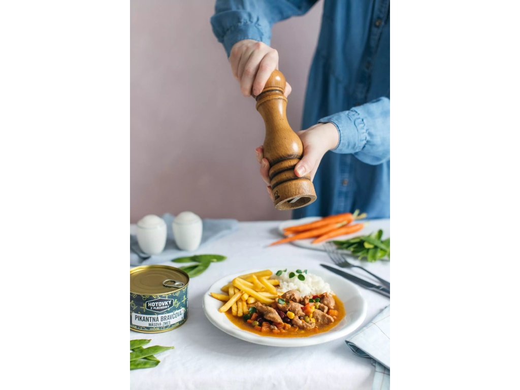 Pikantná bravčová mäsová zmes s hráškom, mrkvou a kukuricou je chutné hotové jedlo, ktoré vám zlepší svojimi farbami a chuťou náladu. S mäsom zo slovenského chovu, ktoré je neuveriteľne mäkké, si vychutnáte maximum chuti. Je to ideálna voľba na rýchly a výdatný obed či večeru, ktorá ušetrí čas.